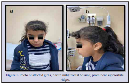 The patient, a 10-year-old girl, product of consanguineous Saudi parents. and have three other healthy children She was born after an uneventful pregnancy after 39 weeks’ gestation with the following birth parameters: weight 3,715 g (±0 SD), length 53 cm (+0.5 SD), and head circumference 34 cm (–1 SD). No antenatal or neonatal complained. She was referred to genetic clinic with history of presented with moderate ID, an attention deficit, and hyperactive behavior, poor concentration and learning disabilities attend special school for difficult learning. No of history seizure or abnormal movements. She was started to crawl at age of 1 years and 3 months and she apparently started to walk without support at the age of 2 years and 8 months. She had delayed speech development. At the age of 5 years, she spoke 4-6 words, and at 9 years of age, she only had spoken 3-word phrases. At the time of evaluation at 8 years of age, her height was 126 cm (10 SD), weight was 25 kg (25 SD), and head circumference was 51 cm (25 SD). She had mild frontal bossing, prominent supraorbital ridges (Figure 1) with normal hands, feet, toes, no chest deformities, and the rest of examination were normal. Magnetic Resonance Imaging (MRI) of the brain at 8 years of age was unremarkable study. Conventional chromosome analysis was normal female karyotype.